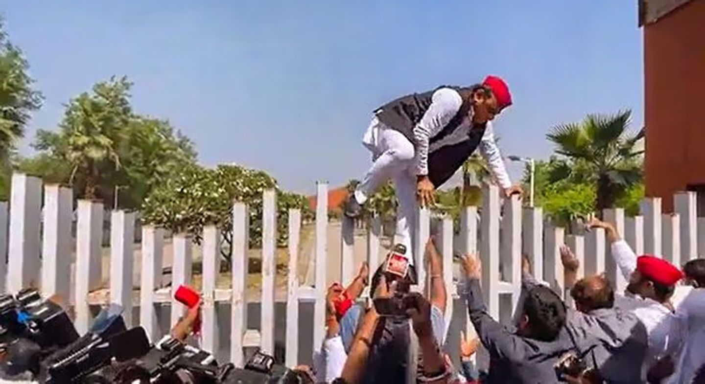 ಅಖಿಲೇಶ್ ಯಾದವ್ ಅವರ ಗೋಡೆ ಜಿಗಿಯುತ್ತಿರುವ ಫೋಟೋ ಸಾಮಾಜಿಕ ಜಾಲತಾಣಗಳಲ್ಲಿ ವೈರಲ್ ಆಗಿವೆ.