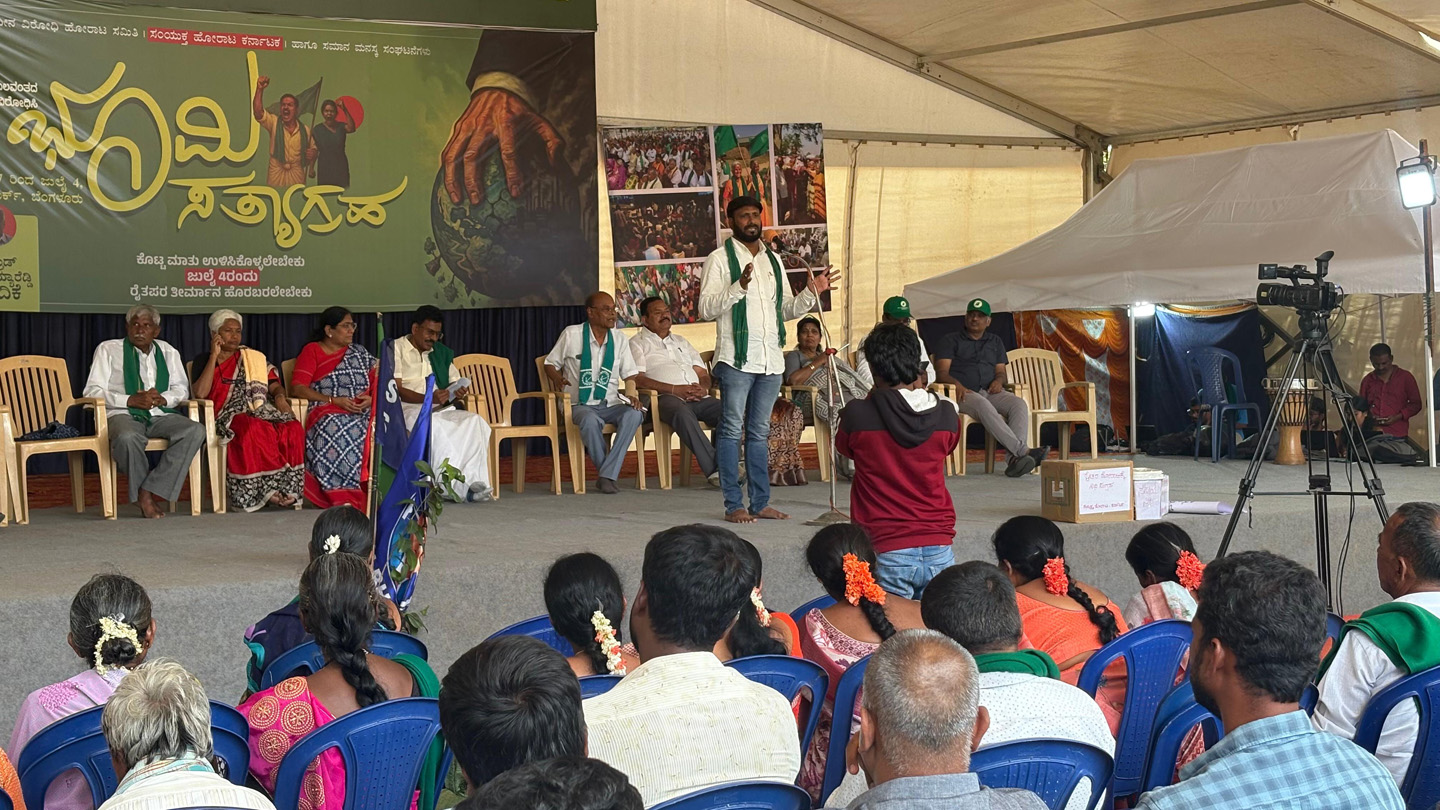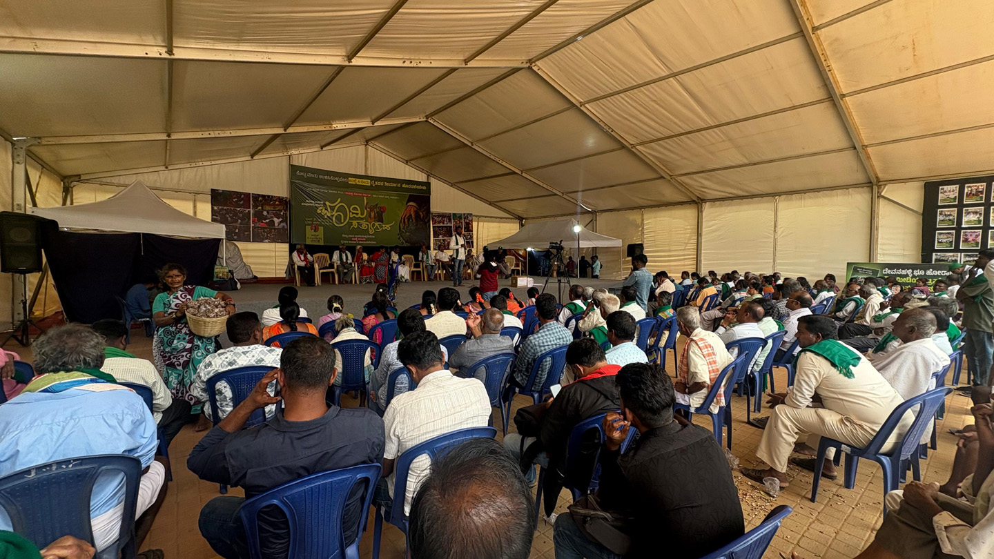 “ದೇವನಹಳ್ಳಿ ತಾಲ್ಲೂಕಿನ ಚನ್ನರಾಯಪಟ್ಟಣ ಹೋಬಳಿಯ 13 ಗ್ರಾಮಗಳ 1,777 ಎಕರೆ ಜಮೀನನ್ನು ಸರ್ಕಾರ ಭೂಸ್ವಾಧೀನ ಮಾಡಲು ಮುಂದಾಗಿದೆ. ಭೂಸ್ವಾಧೀನದ ಪ್ರಕ್ರಿಯೆ ವಿರುದ್ಧ ರೈತರು 1,184 ದಿನ ಶಾಂತಿಯುತವಾಗಿ ಹೋರಾಟ ಮಾಡಿದ್ದಾರೆ. ದೇಶಕ್ಕೆ ಅನ್ನ ನೀಡುವ ರೈತರ ಸಮಸ್ಯೆ ಪರಿಹಾರಕ್ಕೆ ಮುಂದಾಗದ ಸರ್ಕಾರವು, ಕೃಷಿ ಭೂಮಿಯನ್ನು ರಿಯಲ್ ಎಸ್ಟೇಟ್ ಧಂಧೆಕೋರರು, ಕಾರ್ಪೋರೇಟ್ ಕಂಪನಿಗಳಿಗೆ ಮಾರಾಟ ಮಾಡಲು ಹುನ್ನಾರ ಮಾಡಿದೆ. ಕೃಷಿ ಭೂಮಿಯನ್ನು ಕಳೆದುಕೊಂಡರೆ, ರೈತರ ಪರಿಸ್ಥಿತಿ ಏನು”? ಎಂದು ಪ್ರಶ್ನಿಸಿದರು.