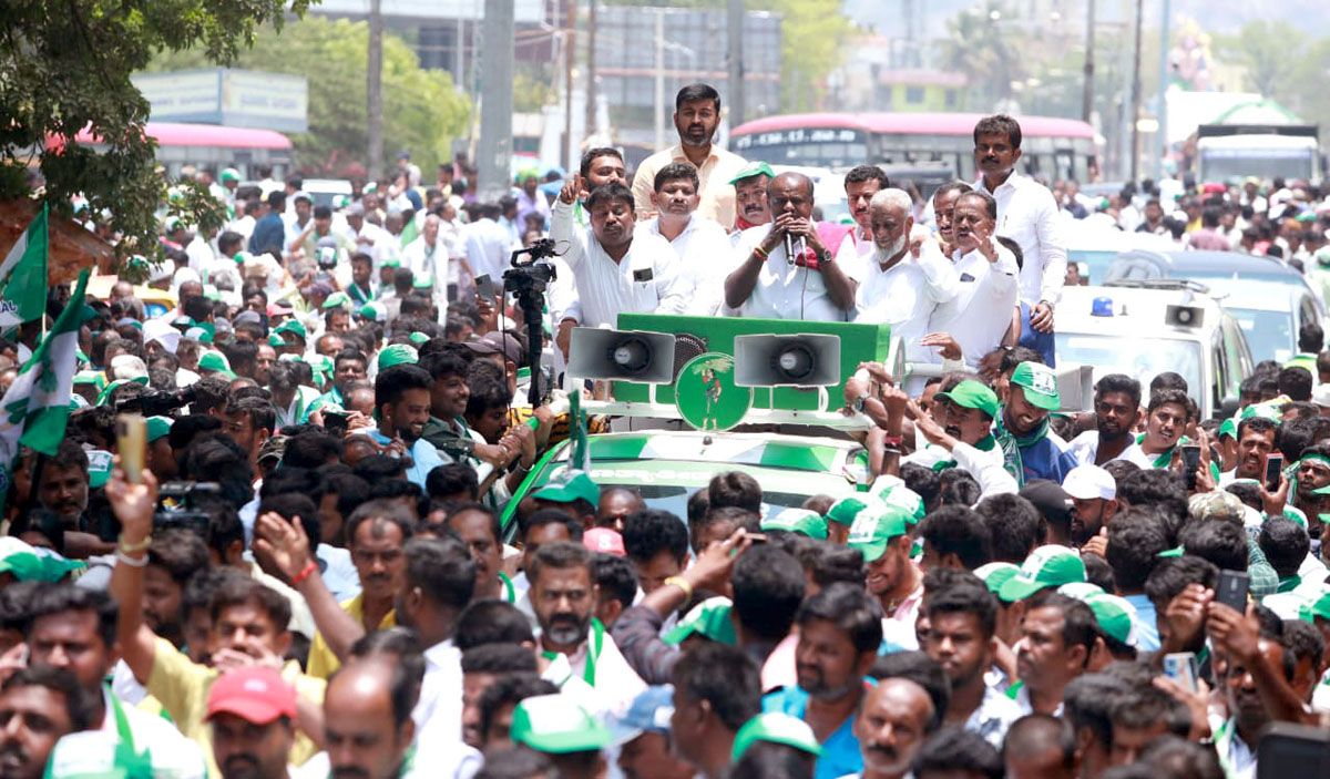 ರಾಮನಗರದಲ್ಲಿ ಜೆಡಿಎಸ್ ಅಭ್ಯರ್ಥಿಯಾಗಿ ನಿಖಿಲ್ ಕುಮಾರಸ್ವಾಮಿ ನಾಮಪತ್ರ ಸಲ್ಲಿಸಿದ್ದಾರೆ. ಈ ವೇಳೆ ಸಾಕಷ್ಟು ಸಂಖ್ಯೆಯಲ್ಲಿ ತಾಲ್ಲೂಕು ಕಚೇರಿ ಮುಂಭಾಗ ಜೆಡಿಎಸ್ ಕಾರ್ಯಕರ್ತರು ಜಮಾವಣೆಗೊಂಡಿದ್ದರು. ಬೆಳಗ್ಗೆ 10 ಗಂಟೆಗೆ ರಾಮನಗರದ ಚಾಮುಂಡೇಶ್ವರಿ ದೇವಾಲಯದಲ್ಲಿ ನಿಖಿಲ್ ಕುಮಾರಸ್ವಾಮಿ ವಿಶೇಷ ಪೂಜೆ ಸಲ್ಲಿಸಿದ್ದಾರೆ. ಬಳಿಕ ಚರ್ಚ್ ಹಾಗೂ ದರ್ಗಾದಲ್ಲಿ ವಿಶೇಷ ಪ್ರಾರ್ಥನೆ ಸಲ್ಲಿಸಿದ್ದಾರೆ. ಬೃಹತ್ ಮೆರವಣಿಗೆ ತೆರಳಿ ಮಧ್ಯಾಹ್ನ 12:30ಕ್ಕೆ ತಾಲೂಕು ಕಚೇರಿಯಲ್ಲಿ ನಾಮಪತ್ರ ಸಲ್ಲಿಸಿದ್ದಾರೆ.