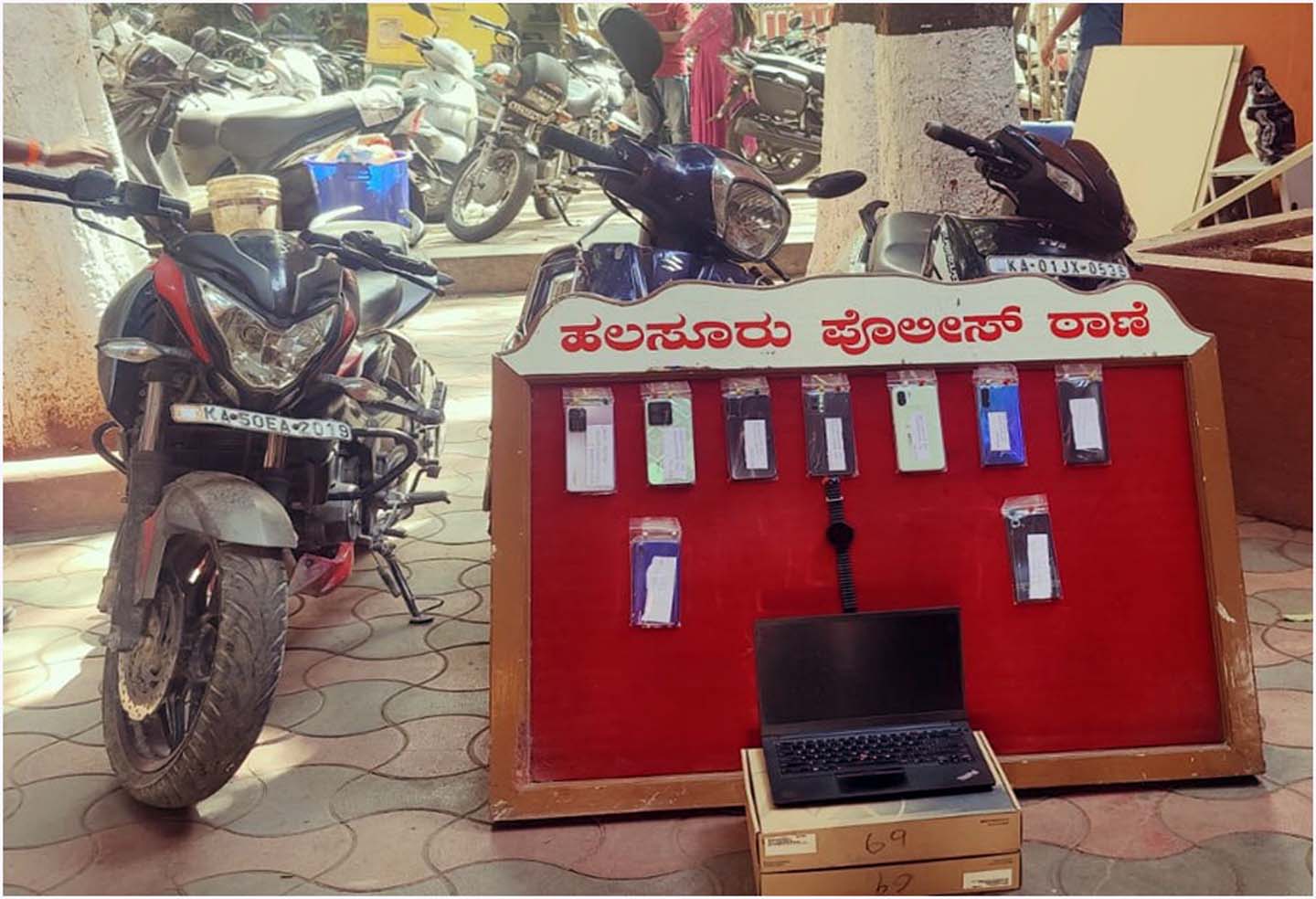 ಬೆಂಗಳೂರು: ಕಳೆದ ಅಕ್ಟೋಬರ್ 17 ರಂದು ಹಲಸೂರು ಪೊಲೀಸ್ ಠಾಣೆಯಲ್ಲಿ ಪ್ರಕರಣ ದಾಖಲಾಗಿದ್ದವು. ಪ್ರಕರಣಕ್ಕೆ ಸಂಬಂಧಿಸಿದಂತೆ ತನಿಖೆ ಕೈಗೊಂಡ ಹಲಸೂರು ಪೊಲೀಸರು ಇಬ್ಬರ ವ್ಯಕ್ತಿಗಳನ್ನು ವಶಕ್ಕೆ ಪಡೆದು ವಿಚಾರಣೆ ನಡೆಸಿದರು. ವಿಚಾರಣೆಯ ವೇಳೆ ಅವರುಗಳು ನೀಡಿದ ಮಾಹಿತಿಯ ಮೇರೆಗೆ 5 ಲಕ್ಷ 50 ಸಾವಿರ ರೂಪಯಿಗಳ ಮೌಲ್ಯದ 3 ದ್ವಿಚಕ್ರ ವಾಹನ, ಲೆನೋವಾ ಲ್ಯಾಪ್ ಟಾಪ್, ವಿವಿಧ ಕಂಪನಿಯ 9 ಮೊಬೈಲ್ ಫೋನ್ ಗಳು ಹಾಗೂ ಒಂದು ಸ್ಮಾರ್ಟ್ ವಾಚನ್ನು ವಶಪಡಿಸಿಕೊಳ್ಳಲಾಯಿತು.