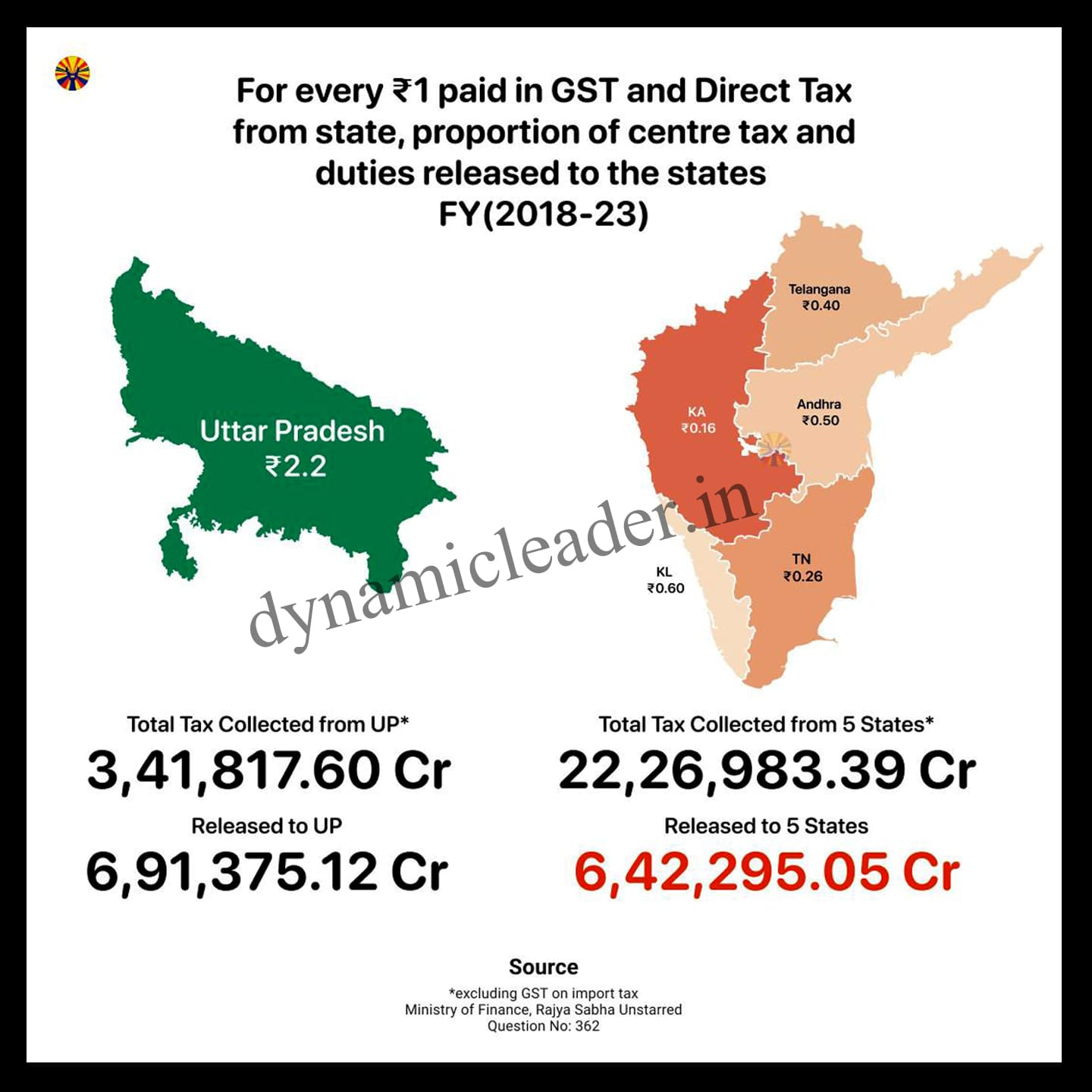 ಕಳೆದ 5 ವರ್ಷಗಳಲ್ಲಿ ಮೇಲೆ ತಿಳಿಸಲಾದ ದಕ್ಷಿಣದ ರಾಜ್ಯಗಳಿಗೆ ಬಿಡುಗಡೆಯಾದ ಕೇಂದ್ರ ತೆರಿಗೆಗಳು ಮತ್ತು ಸುಂಕಗಳು (ಒಟ್ಟು) – ರೂ.6,42,295.05 ಕೋಟಿಗಳು.