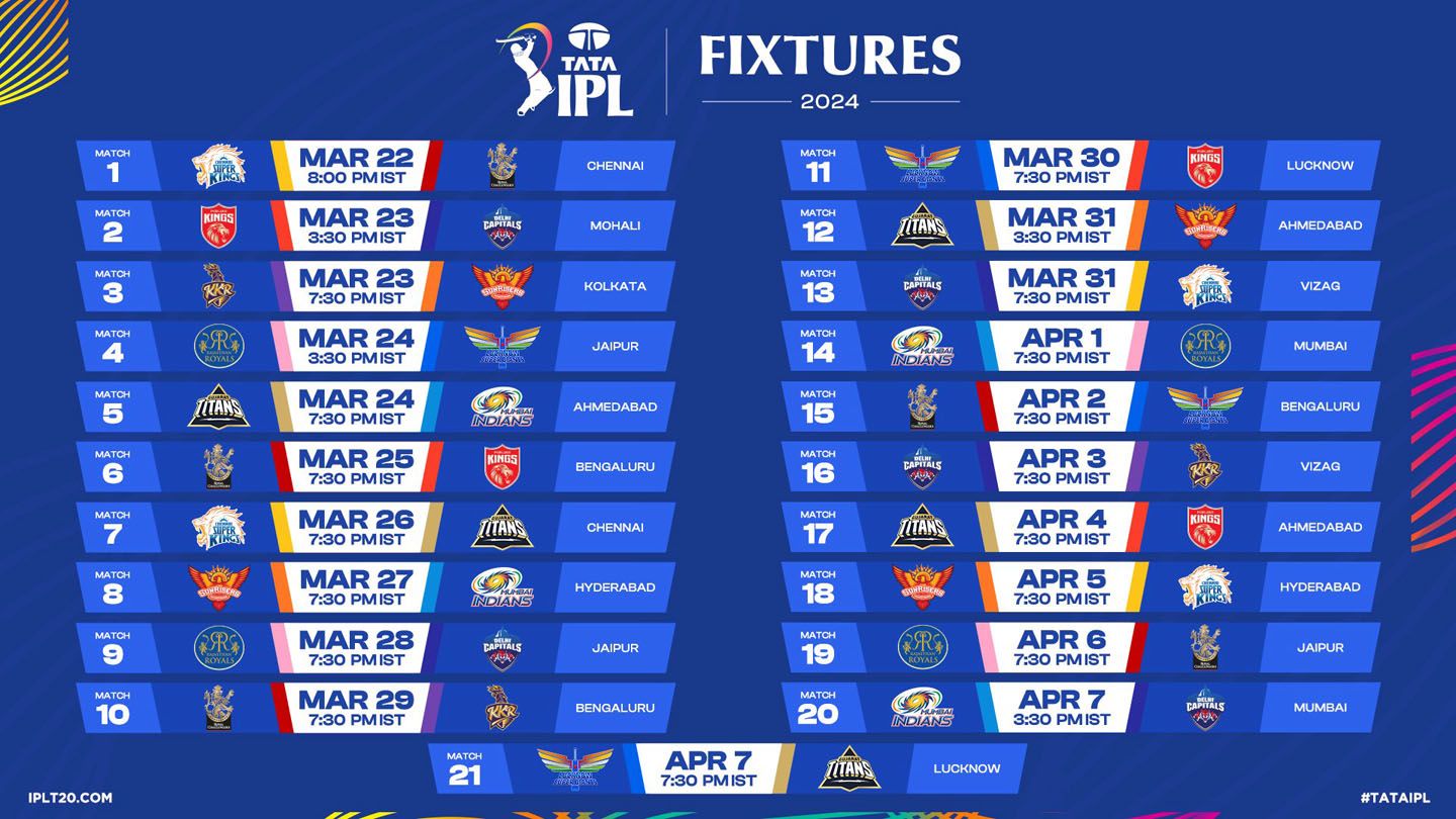 ಮಾರ್ಚ್ 22 ರಂದು ಚೆನ್ನೈನ ಚೆಪಾಕ್ಕಂ ಸ್ಟೇಡಿಯಂನಲ್ಲಿ ಪಂದ್ಯ ನಡೆಯಲಿದೆ. ಲೋಕಸಭೆ ಚುನಾವಣೆ ಘೋಷಣೆಯಾದ ನಂತರ ಉಳಿದ ಸ್ಪರ್ಧೆಗಳ ವೇಳಾಪಟ್ಟಿ ಬಿಡುಗಡೆಯಾಗುವ ನಿರೀಕ್ಷೆ ಇದೆ.