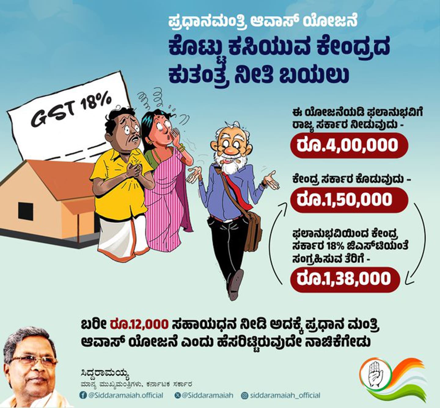 ನರೇಂದ್ರ ಮೋದಿ ಸರ್ಕಾರ ಜುಜುಬಿ ರೂ.12,000 ಕೊಟ್ಟು ಅದಕ್ಕೆ ಪ್ರಧಾನಮಂತ್ರಿ ಆವಾಸ್ ಯೋಜನೆ ಎಂದು ಹೆಸರಿಟ್ಟಿರುವುದೇ ನಾಚಿಕೆಗೇಡು ಎಂದು ಕಿಡಿಕಾರಿದ್ದಾರೆ.