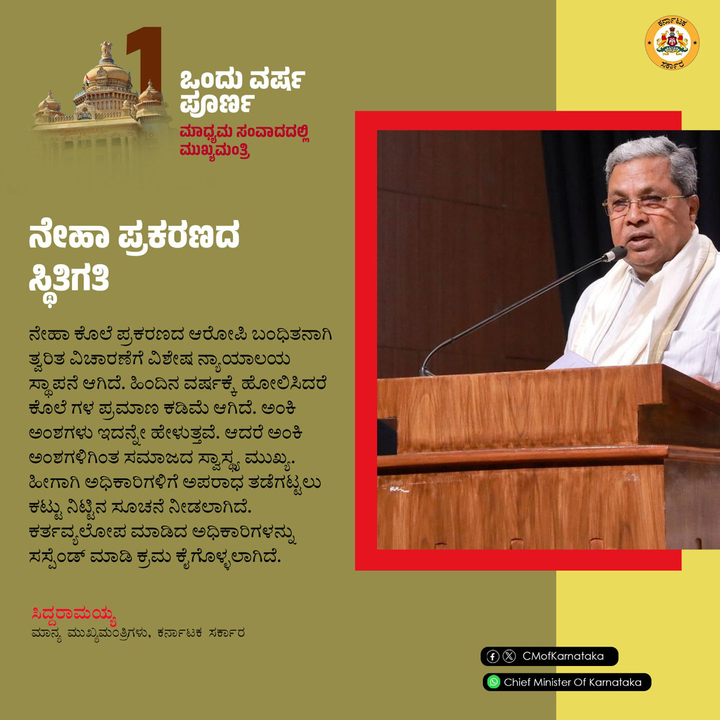 ಅಂತೆಯೇ, ನಾಡಿನ ಏಳು ಕೋಟಿ ಕನ್ನಡಿಗರ ಆಶೀರ್ವಾದದಿಂದ ನಾವು ಅಧಿಕಾರಕ್ಕೆ ಬಂದು ಇಂದಿಗೆ ಒಂದು ವರ್ಷ ತುಂಬಿದೆ. ಈ ಒಂದು ವರ್ಷದ ಅವಧಿಯಲ್ಲಿ ಪಾರದರ್ಶಕ, ಭ್ರಷ್ಟಾಚಾರ ರಹಿತವಾದ ಜನಪರ ಆಡಳಿತ ನೀಡುವ ಪ್ರಾಮಾಣಿಕ ಪ್ರಯತ್ನ ಮಾಡಿದ್ದೇವೆ. ರಾಜ್ಯವನ್ನು ಸರ್ವಜನಾಂಗದ ಶಾಂತಿಯ ತೋಟ ಮಾಡಬೇಕೆಂಬ ಆಶಯ ನಮ್ಮದು, ನಮ್ಮ ಈ ಪ್ರಯತ್ನಕ್ಕೆ ನಿಮ್ಮೆಲ್ಲರ ಬೆಂಬಲ ಇರಲಿ. ಕಳೆದೊಂದು ವರ್ಷದಿಂದ ನಮ್ಮ ಸರ್ಕಾರಕ್ಕೆ ತಾವು ನೀಡುತ್ತಿರುವ ಸಹಕಾರ, ನಮ್ಮ ಮೇಲಿಟ್ಟಿರುವ ವಿಶ್ವಾಸಕ್ಕೆ ಅನಂತ ಧನ್ಯವಾದಗಳು ಎಂದು ಮುಖ್ಯಮಂತ್ರಿ ಸಿದ್ದರಾಮಯ್ಯ ಹೇಳಿದ್ದಾರೆ.