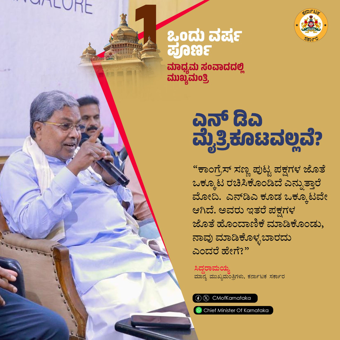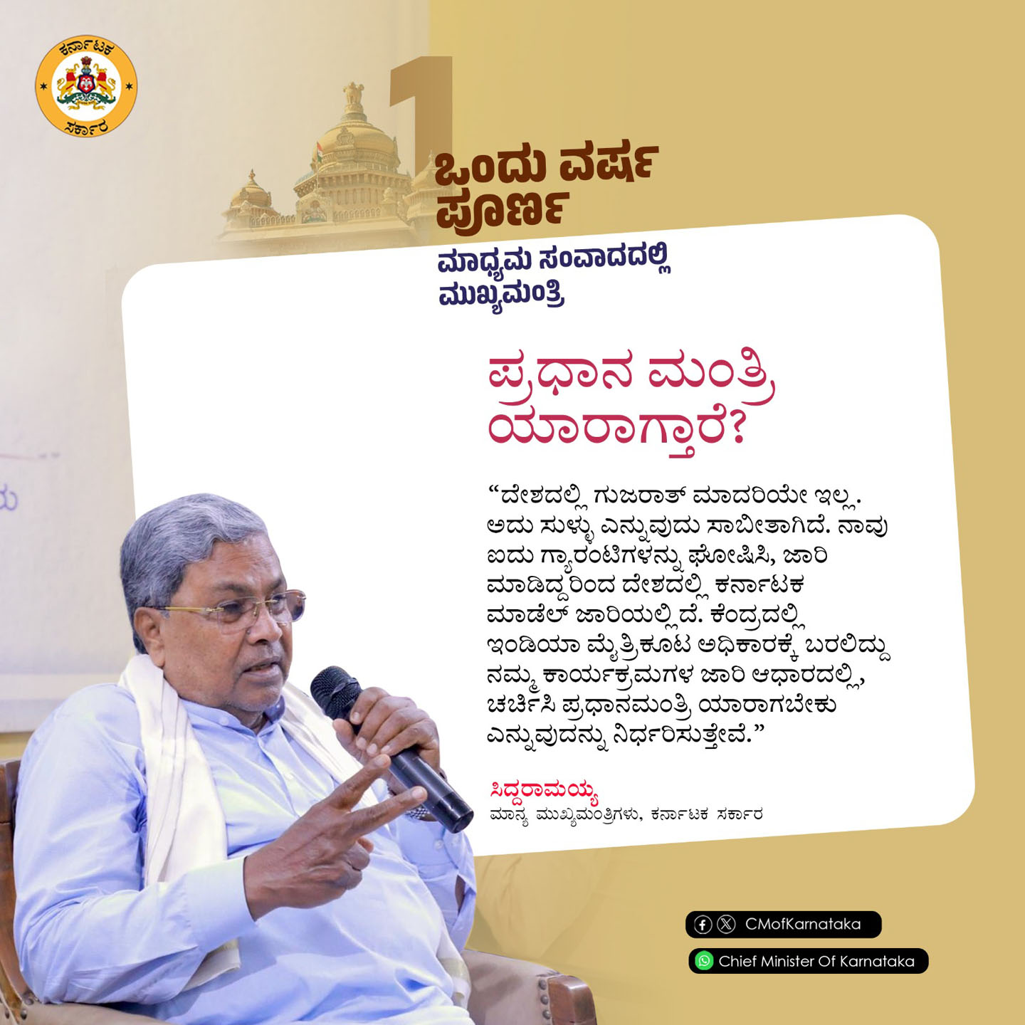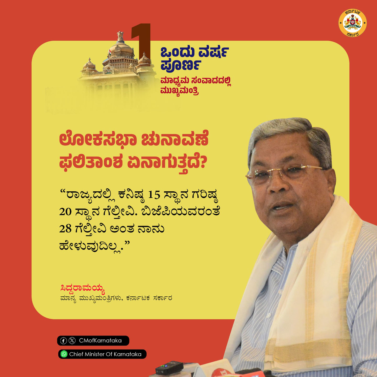 ಬೆಂಗಳೂರು: ಸರ್ಕಾರವು ಒಂದು ವರ್ಷ ಪೂರೈಸಿದ ಹಿನ್ನೆಲೆಯಲ್ಲಿ ಇಂದು ಬೆಂಗಳೂರಿನ ಪ್ರೆಸ್ಕ್ಲಬ್ ನಲ್ಲಿ ಮಾನ್ಯ ಮುಖ್ಯಮಂತ್ರಿ ಸಿದ್ದರಾಮಯ್ಯ ಅವರು ಪತ್ರಕರ್ತರೊಂದಿಗೆ ಸಂವಾದ ನಡೆಸಿದರು. ಈ ಸಂವಾದದ ಕೆಲವು ಪ್ರಮುಖ ಪ್ರಶ್ನೆಗಳಿಗೆ ಅವರು ನೀಡಿದ ಉತ್ತರವನ್ನು ಮುಖ್ಯಮಂತ್ರಿಗಳು ಪೋಸ್ಟರ್ ಆಗಿ ಬಿಡುಗಡೆ ಮಾಡಿದ್ದಾರೆ.