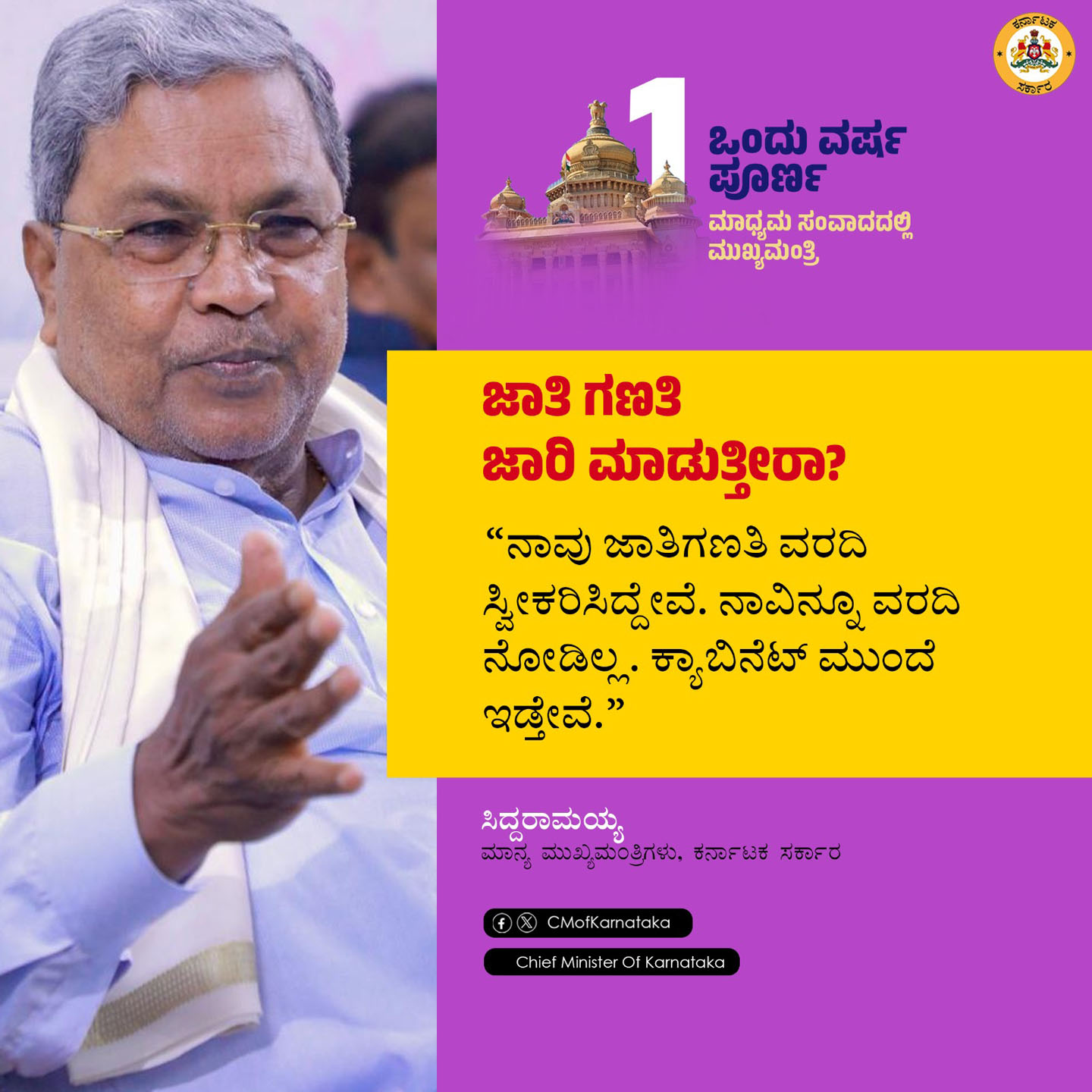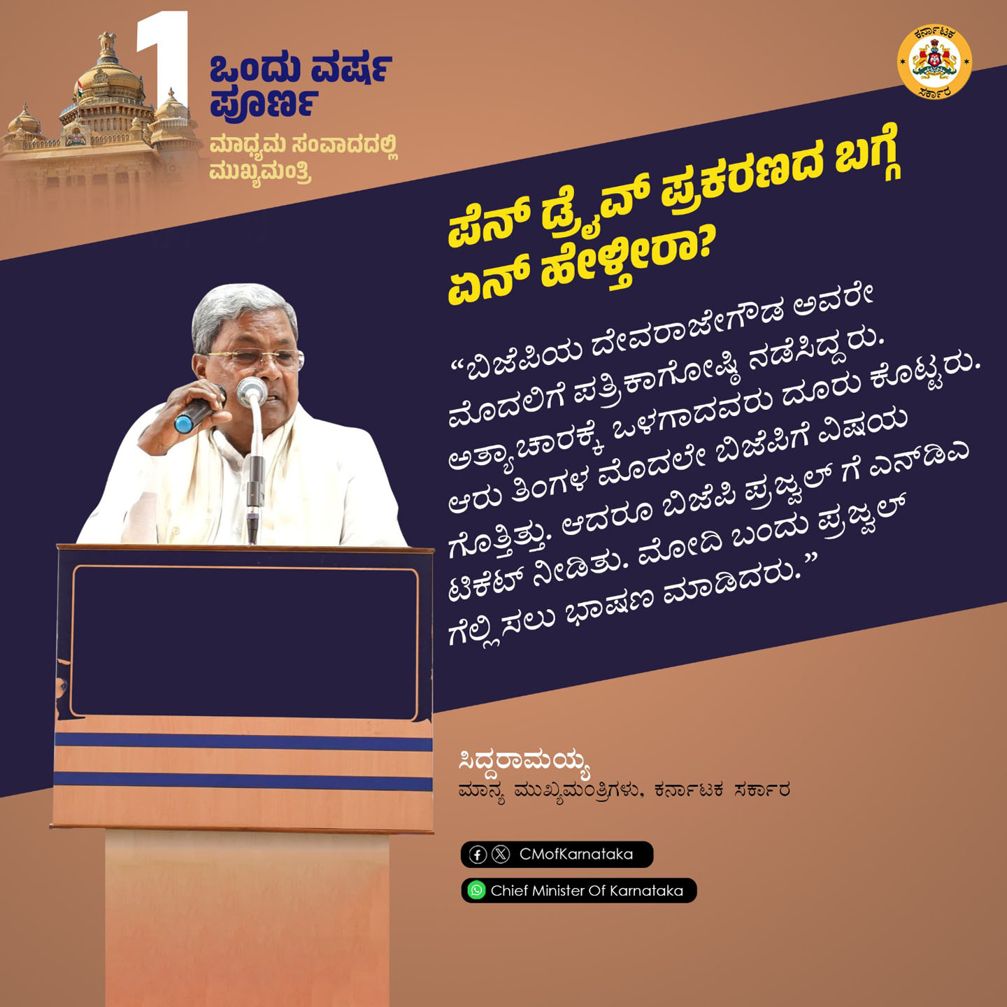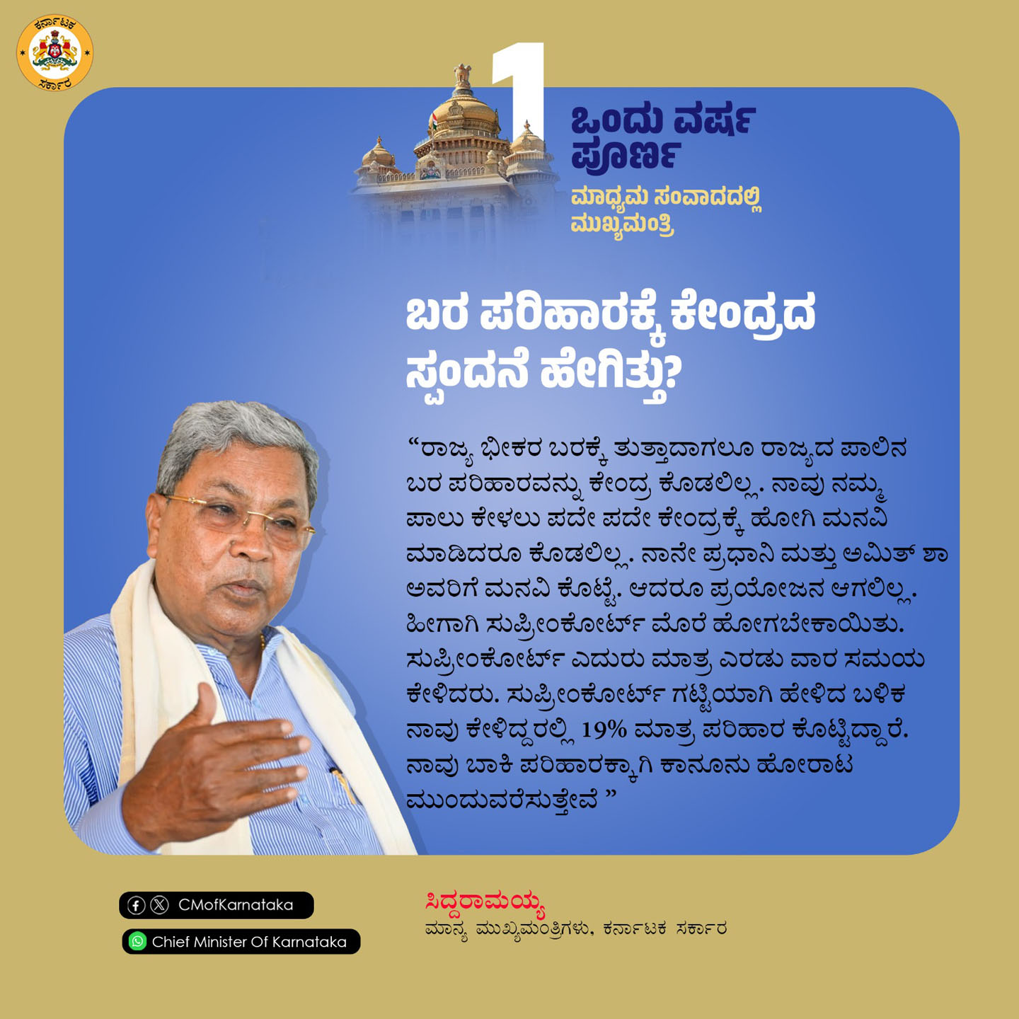 ಬೆಂಗಳೂರು: ಸರ್ಕಾರವು ಒಂದು ವರ್ಷ ಪೂರೈಸಿದ ಹಿನ್ನೆಲೆಯಲ್ಲಿ ಇಂದು ಬೆಂಗಳೂರಿನ ಪ್ರೆಸ್ಕ್ಲಬ್ ನಲ್ಲಿ ಮಾನ್ಯ ಮುಖ್ಯಮಂತ್ರಿ ಸಿದ್ದರಾಮಯ್ಯ ಅವರು ಪತ್ರಕರ್ತರೊಂದಿಗೆ ಸಂವಾದ ನಡೆಸಿದರು. ಈ ಸಂವಾದದ ಕೆಲವು ಪ್ರಮುಖ ಪ್ರಶ್ನೆಗಳಿಗೆ ಅವರು ನೀಡಿದ ಉತ್ತರವನ್ನು ಮುಖ್ಯಮಂತ್ರಿಗಳು ಪೋಸ್ಟರ್ ಆಗಿ ಬಿಡುಗಡೆ ಮಾಡಿದ್ದಾರೆ.